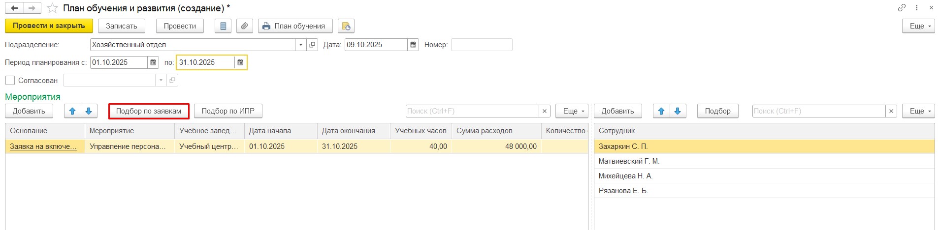 Добрый день!Документ План обучения и развития заполняется по данным документа Заявка на включение в план обучения либо по Индивидуальным планам развития(ИПР).