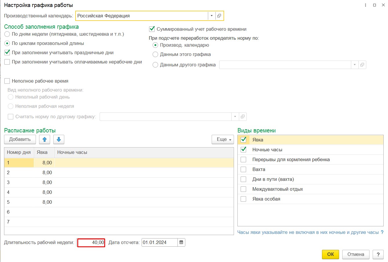 Добрый день! Программа при определении часов,подлежащих оплате, в графике смотрит на значение в поле Длительность рабочей недели. Пришлите пожалуйста скриншот настройки графика, проверим что указано в этом поле.
