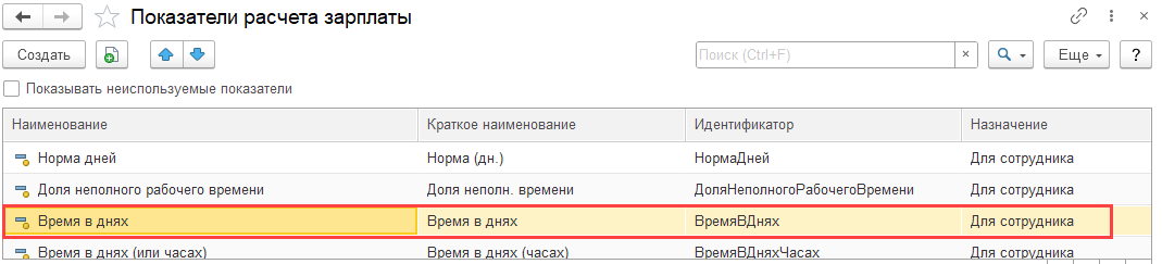 А если в списке показателей поставить флажок «Показывать неиспользуемые показатели», то сможем увидеть показатель «Время в днях»?