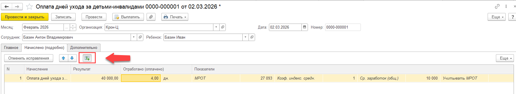 — пробуем создать документ Оплата дней ухода за детьми-инвалидами