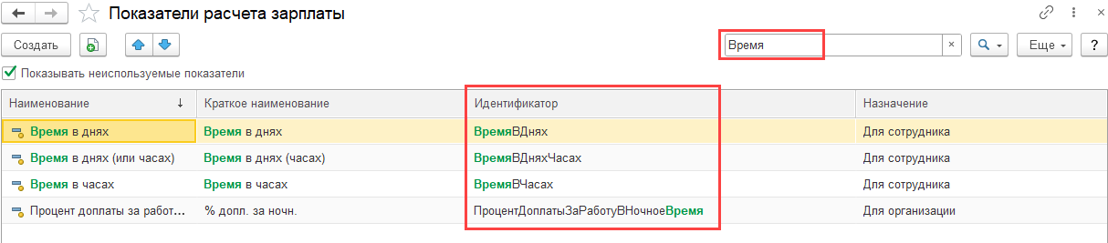 Сделайте отбор в списке показателей по слову «время» и приложите скриншот. Нам важно проверить «Идентификатор». Посмотрим, какие у Вас показатели будут отобраны: