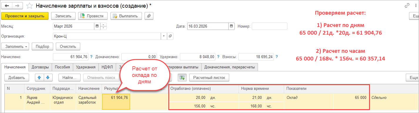 Давайте проверим, как происходит расчет начисления Сдельный заработок (для работающих по окладу).