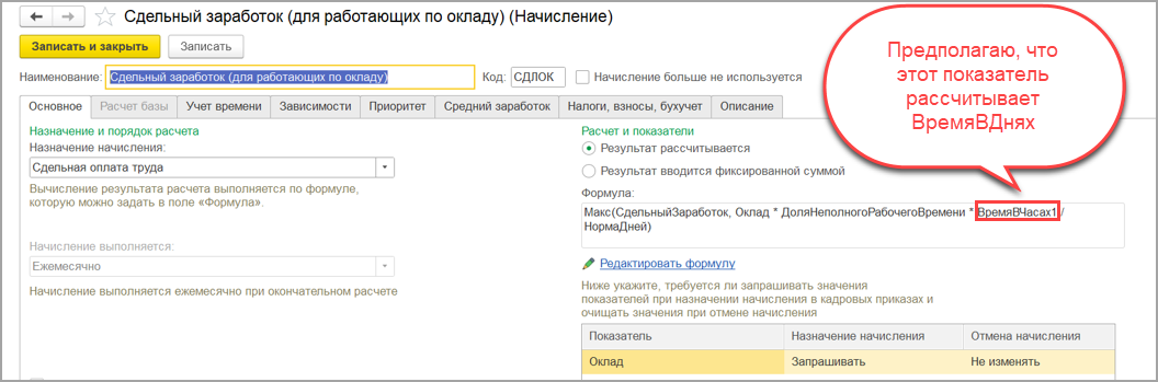 — меняем показатель в формулах начисления «Сдельный заработок (для работающих по окладу)» и Оплата по окладу вместо ВремяВЧасах1 указываем ВремяВДнях. Это нужно для того, что если нужно будет рассчитать эти начисления не появилось ошибок