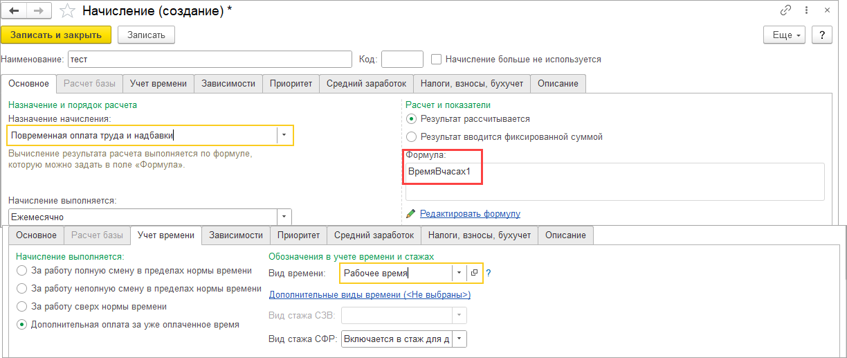 — настроим для проверки техническое начисление, например «тест», в формуле пропишем только наш показатель ВремяВЧасах1, который хотом проверить, например: