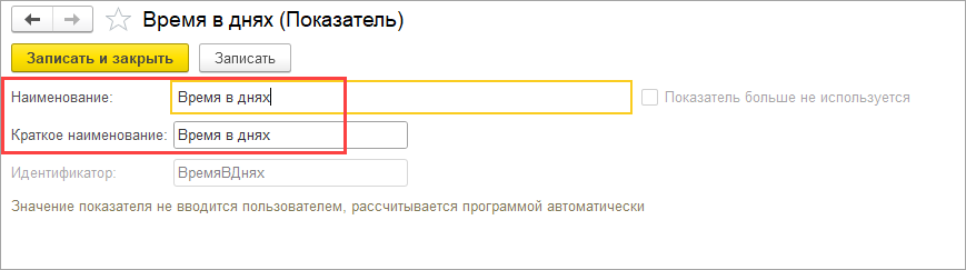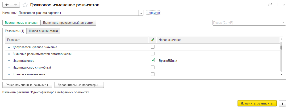 Поэтому предлагаю: вернуть показателю ВремяВЧасах1 правильное наименование, а также обработкой группового изменения реквизитов вернуть идентификатор показателя ВремяВДнях