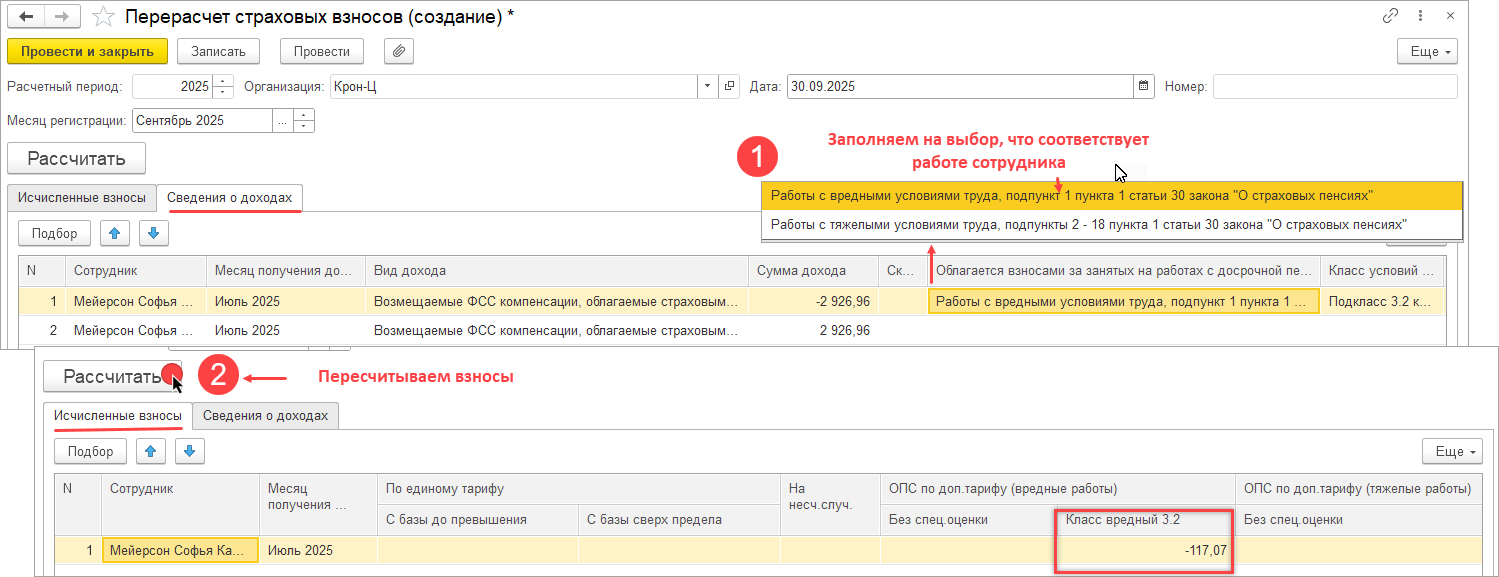 — на вкладке Исчисленные взносы по кнопке Рассчитать — произойдет перерасчет взносов по доп. тарифу.