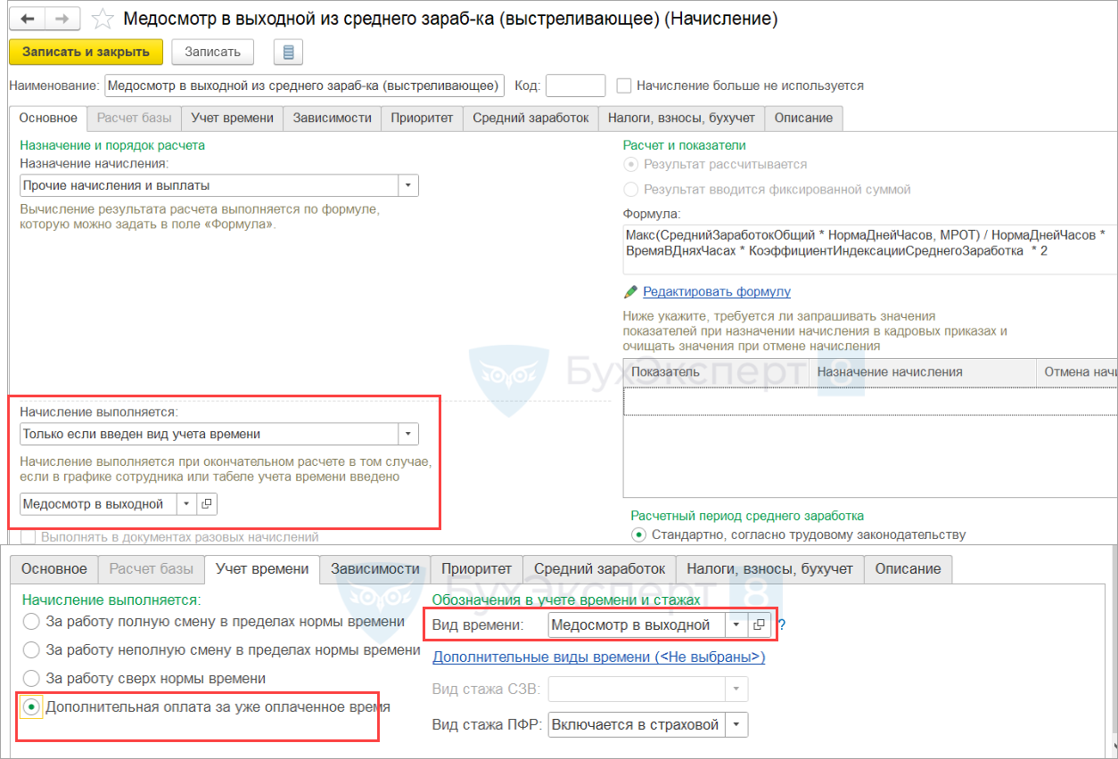 — сделаем настройки выстреливающего начисления (для него не нужно вводить документ Отсутствие с сохранением оплаты, оно будет рассчитываться если введен вид учета времени Медосмотр в выходной), как предлагается в статье Медосмотр в выходной день – как оплатить в ЗУП 3.1