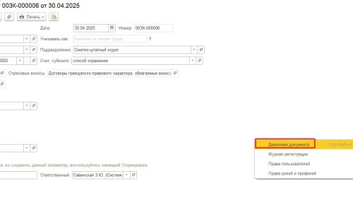 Что касается нашей исходной проблемы, пока не пойму в чем может быть причина — у меня в демобазе попадают начисления по актам🤔 Давайте посмотрим какие движения по регистрам делает Ваш акт — для этого справа нажмем Еще- Отчеты-Движения документа(пример скриншота прилагаю)
