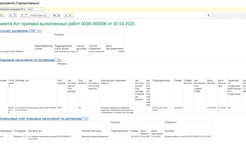 В регистре взгляд зацепился за колонку Месяц начисления в Плановых начислениях по договорам — у Вас стоит 15.04.2025. В демобазе в регистре в этой колонке стоит дата 01.04.2025 и это логично, ведь это поле месяц в документе, и месяц у нас начинается с первого числа, странно как так вообще получилось. Уточните пожалуйста, акт создавался вручную в программе, не с помощью загрузки? Также подскажите пожалуйста, такая проблема впервые возникла с этим сотрудником, ранее акты попадали в начисление по договорам? Также напишите пожалуйста номер релиза, на котором Вы работаете.