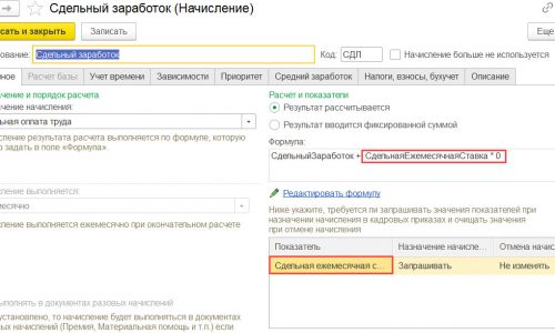 2. В формуле оплаты по сдельному заработку указать + СдельнаяЕжемесячнаяСтавка * 0. Указываем в настройках начисления, что показатель СдельнаяЕжемесячнаяСтавка нужно запрашивать при назначении начисления.