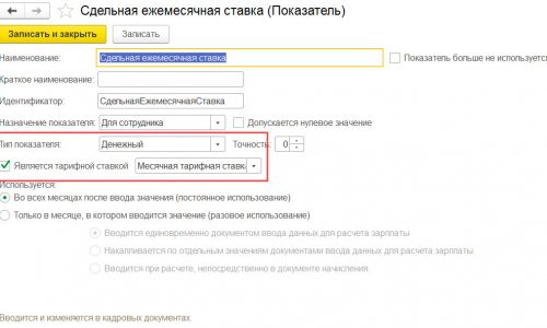 1. Создала оказатель СдельнаяЕжемесячнаяСтавка — это по сути Ваш показатель стоимость ежемесячной ставки 1-го разряда, который включен в совокупную тарифную ставку в настройках. В настройках показателя указала, что он денежный и установила флажок «Является тарифной ставкой», указала, что это месячная тарифная ставка.