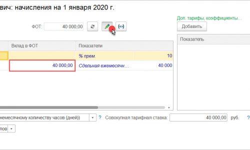 Поэтому, чтобы убедиться, давайте посмотрим какие показатели из назначенных данному сотруднику входят в состав совокупной тарифной ставки еще? Или просто попробуйте ввести вклад в ФОТ для сдельной оплаты (колонка для ввода этого значения открывается по кнопке с зеленым карандашом)
