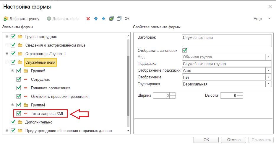 В меню справа Еще — Изменить форму, ставим галочку Служебные поля, применяем настройки. Внизу документа появится блок Служебные поля. В нём будет поле Текст запроса XML. Копируем текст запроса полностью и вставляем в WORD. В тексте будет видно ФИО, которое ушло из СФР от нас.
