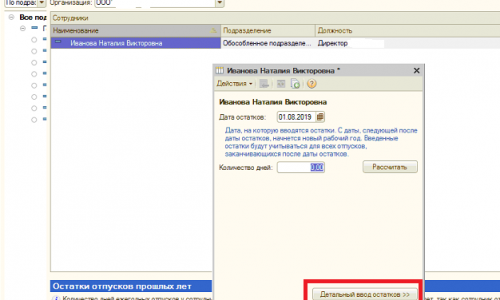 1. Здравствуйте! Нужно зайти в меню Кадровый отчет — Остатки отпусков. Выбрать конкретного сотрудника, нажать Редактировать остаток отпуска — Детальный ввод остатков.