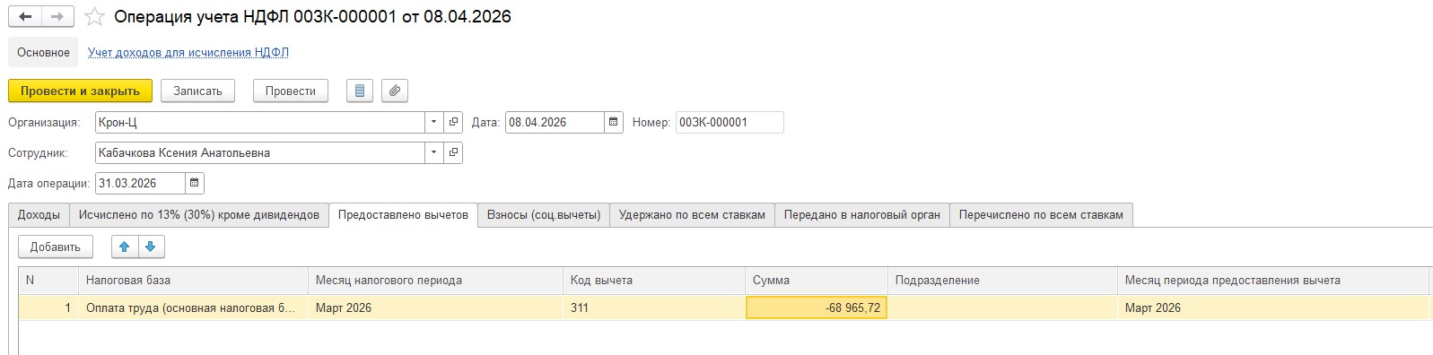 1. Здравствуйте!Смоделировала ситуацию в демобазе на Ваших цифрах, столкнулась с такой же проблемой как у Вас — неверно рассчитан НДФЛ и ошибка при заполнении 6-НДФЛ за 1 квартал. Вы верно отметили,что дело в том,что переносится фактическая дата выплаты. Дело в том,что при изменении даты выплаты,программа переносит доход в следующий месяц,но не трогает предоставленный вычет. В результате у нас получается отрицательная налоговая база в 6-НДФЛ. Чтобы исправить проблему предлагаю отсторнировать вычет в марте на величину аванса,который в итоге выплатили в апреле — 68965,72