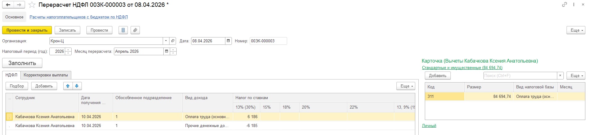 Затем проводим перерасчет НДФЛ в апреле