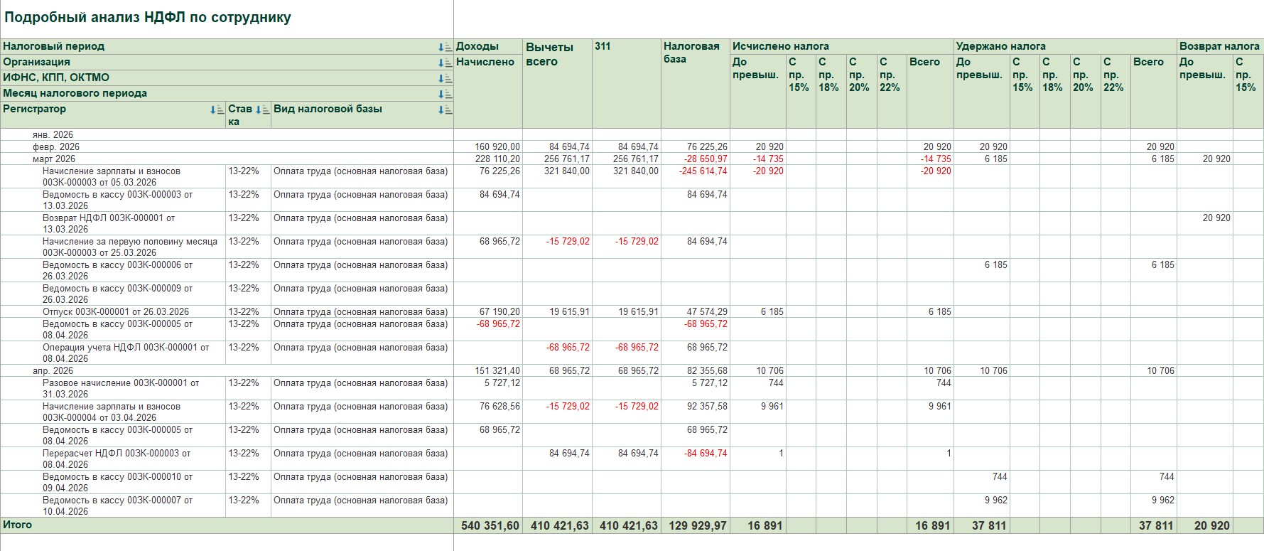 Сотруднику выплатили аванс и зп за январь и удержали НДФЛ в сумме 20920 руб. В начале февраля пришло уведомление по нему о праве на имущественный вычет в сумме 410421,63 руб. До начисления и выплаты аванса за февраль (25.02) провели вычет по уведомлению февралем, но с января — получился излишне удержанный НДФЛ 20920 руб. Затем начислили аванс за февраль и должны были выплатить его 25.02, но задержали и заплатили только 13.03 вместе с заработной платой за февраль. После этого делаем возврат НДФЛ сотруднику и выплачиваем 13.03. 20920. Начисляем аванс за март 25.03, но опять же выплату перенесли на 08.04. После этого 26.03 начисляем и выплачиваем отпуск, на его часть начисляется НДФЛ, так как вычет исчерпан. Если посмотреть подробный анализ, то не верно исчислена налоговая база, не идет НДФЛ за квартал. Я попробовала провести все документы в хронологическом порядке и в даты, которые должны быть (например, аванс за февраль 25 числа, зарплата за февраль 10.03) и программа отрабатывает правильно. Я так понимаю, что при переносе выплаты аванса на другой месяц программа делает ошибки. Как исправить ошибки? Как быть в таком случае?