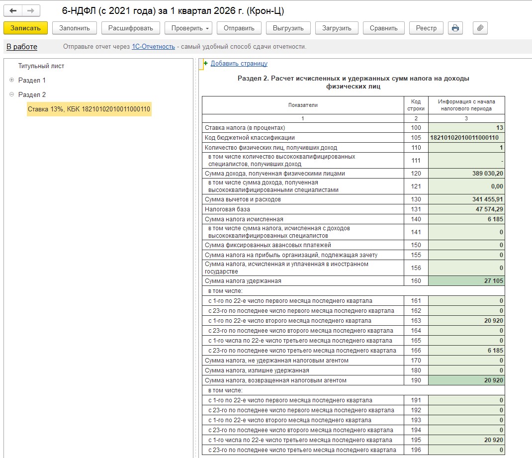 В 6-НДФЛ тоже ушла ошибка, в моем отчете только один сотрудник,чтобы было легче понять как заполнились по нему суммы