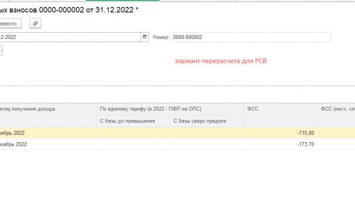 создаем второй документ Перерасчет страховых взносов Расчетный период 2022, Месяц регистрации январь 2023. Суммы перерасчета взносов должны остаться теми же, только для отражение зарплаты в бухучете Января 2023 это документ будет делать проводки для уменьшения сумм к оплате.