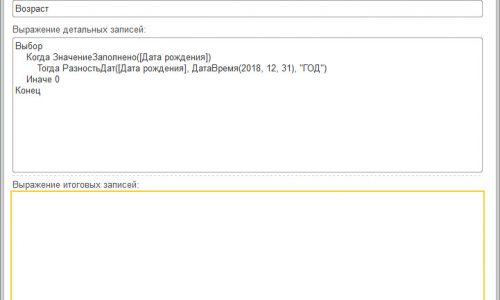 Для того, чтобы вычислить возраст ребенка можно создать пользовательское поле, назвав его «Возраст» и указать выражение, приведенное на скриншоте. На вкладке «Отбор» укажите отбор по полю «Степень родства» со значениями «Сын» и «Дочь».