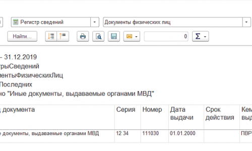 Здравствуйте! Вам удобнее будет сформировать Универсальный отчет (раздел Администрирование — Печатные формы, отчеты и обработки) по регистру сведений «Документ физических лиц» в отборе укажите вид документа «Иные документы, выдаваемые органами МВД».