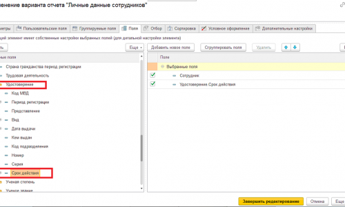 Тогда вернёмся к настройке отчета «Личные данные сотрудников». В доступных данных на закладке поля есть папка «Личные данные» , в ней папка «Удостоверение» и там «Срок действия».