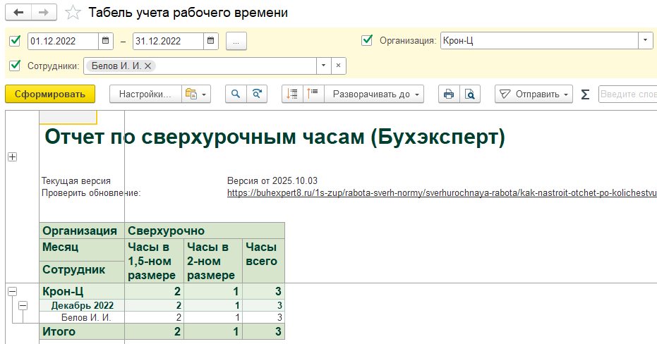 Добрый день! Проверьте, пожалуйста, если за этот же период сформировать типовой отчет Табель учета рабочего времени (Т-13), в нём сверхурочные часы будут?