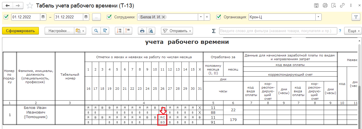 Добрый день! В этом случае сформировался обычный табель за месяц с отбором по сотруднику