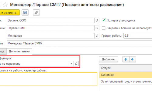 Тут скорее всего проблема в том, что Вы выводите трудовую функцию из справочника «Должности», а она там может быть не заполнена. Попробуйте вывести трудовую функцию из штатного расписания, т.е. из «Позиции». Пример на скриншоте.