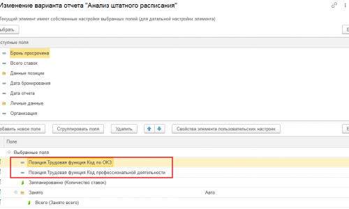 Настроила отчет, получается что на базе штатных сотрудников, в отчет не попадают свободные должности. Пытаюсь сделать аналогичный отчет на базе отчета Штатное расписание. Новые колонки добавляю, но они почему-то не выводятся. Помогите пожалуйста. Скрин прилагаю.