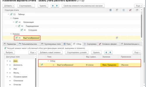 Добрый день! Я воспользовалась настройками отчета Т-13, но при отборе по Основному времени в отчет выходят еще и ночные в днях, у которых основное время Праздники. В результате дни, относящиеся к праздничныным увеличиваются на дни приходящиеся праздник(ночные). Как указать в настройках, что нужны только дни выходов?