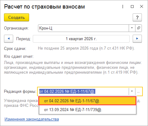 Поэтому если у Вас ЗУП 3.1.34.251 / 3.1.37.49 и более новый релиз, то перед формированием РСВ выбираем редакцию утвержденную Приказом ФНС от 04.02.2026 № ЕД-1- 11/67@: