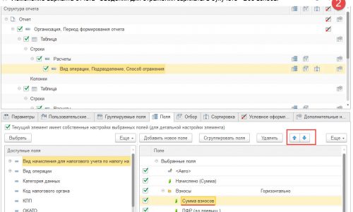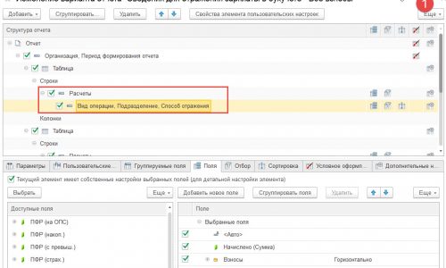 В структуре отчета новое пользовательское поле необходимо будет добавить в раздел «Строки» в группировки «Расчеты» и «Вид операции, Подразделение, Способ отражения» (скриншот №1 прилагаю). Местоположение самого поля можно будет изменить с помощью синих стрелок (скриншот №2)
