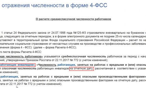 «В полях «Численность работающих инвалидов», «Численность работников, занятых на работах с вредными и (или) опасными производственными факторами» указывается списочная численность работающих инвалидов, работников, занятых на работах с вредными и (или) опасными производственными факторами…. на отчетную дату;«