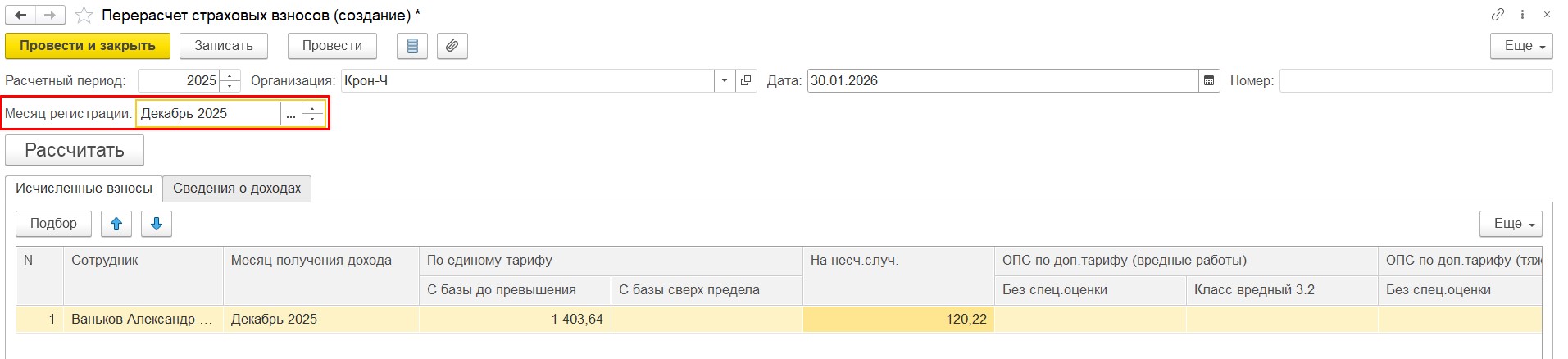 Добрый день! Сам перерасчет начисления выполнен в документе «Доначисление, перерасчет», который зарегистрирован январем 2026г. После чего документом «Перерасчет страховых взносов» пересчитаны взносы. Дата регистрации документа в данном случае не влияет (тестировали), т.к. им регистрируется только перерасчет самих взносов (скрины прилагаю).