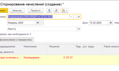 1. Здравствуйте! Необходимо ввести документ «Сторнирование начислений» (раздел Зарплата — См.также), в котором выбрать командировку и указать месяц начисления «февраль 2020», перерасчет должен появиться на закладке «Доначисления и перерасчеты». Дополнительно про документ «Сторнирование начислений» можно посмотреть видео с 2:18 — Исправление и сторнирование документов .