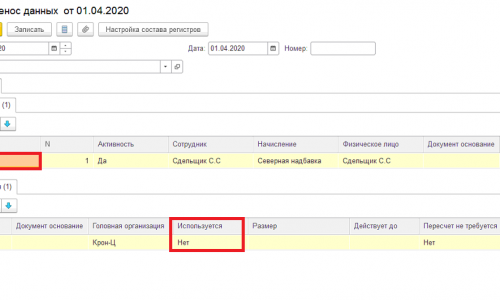 Елена, добрый день. И всё-таки мне нужно уточнить у вас заполнение док-та Перенос данных. Я ввожу его апрелем, с 01.04.20, в копии базы. Скриншот добавляю — вторую правую часть док-та Перенос данных, которая у вас не поместилась в показательный пример. То, как у вас отражено в левой части документа, я повторила в базе, только в апреле. А далее что проставить в графах?? напишите, пож-та. Пока у меня не получилось изменить применение сев.надбавки. При перезаполнении апрельского Начисления зарплаты самой суммы надбавки нет, но по-прежнему есть пустая строка с Сев.надбавкой по сотруднице. Как избавиться от строки в Начислении зарплаты??
