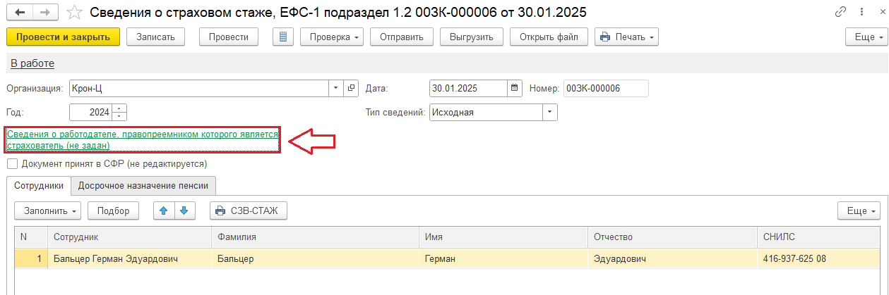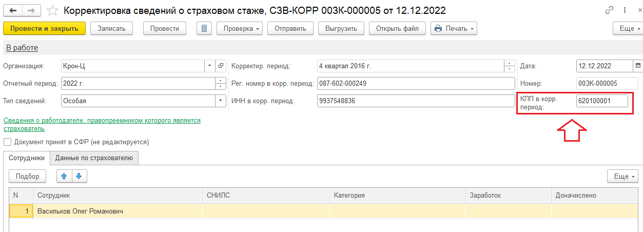 Но Вы скорее всего первичный отчет уже сдавали и нужна корректировка, она создается в разделе Кадры — Документы персучета — создать Корректировка сведений о страховом стаже, ЕФС-1 подраздел 1.2 и здесь прямо в шапке можно скорректировать КПП: