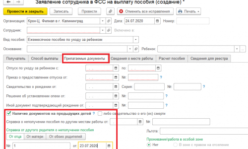 Проверьте в заявлении сотрудника в ФСС на закладке «Прилагаемые документы» при установленной галочке «Наличие документов на предыдущих детей» заполнены ли данные по справке от другого родителя о неполучении пособия (дата и номер)?