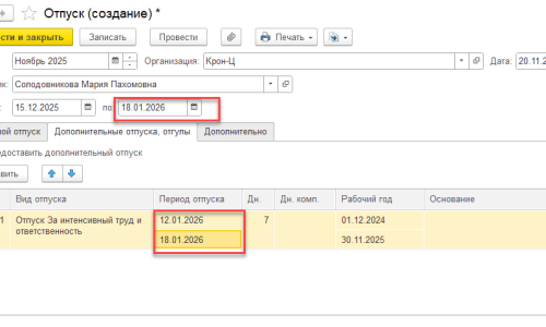 Если есть необходимость предоставить основной отпуск на 20 дней, то кадровик должен изменить число дней основного отпуска на 20 дней. В этом случае период дополнительного отпуска сдвинется – с 12.01.2026 по 18.01.2026
