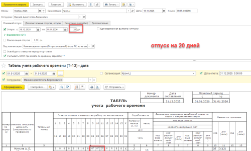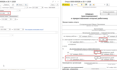 1. При вводе документа Отпуск установить дату начала отпуска, а затем указать на сколько дней надо предоставить отпуск. Мы вводим в программу начало отпуска 15.12.25 и 20 дней. Программа автоматически считает окончание отпуска 11.01.26. В этом случае в приказе на отпуск пишем: «Предоставить отпуск сроком на 20 дней с 15.12.25 по 11.01.26»