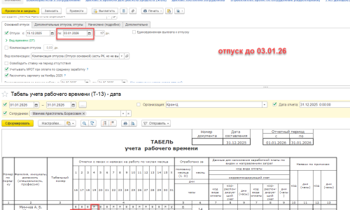Если в приказе стоит отпуск с 15.12.25 по 03.01.26 (20 дней) +дополнительный с 04.01.26 по 15.01.26 (7 дней). Тогда программа считает основной отпуск по 31.12.25 (17 дней).