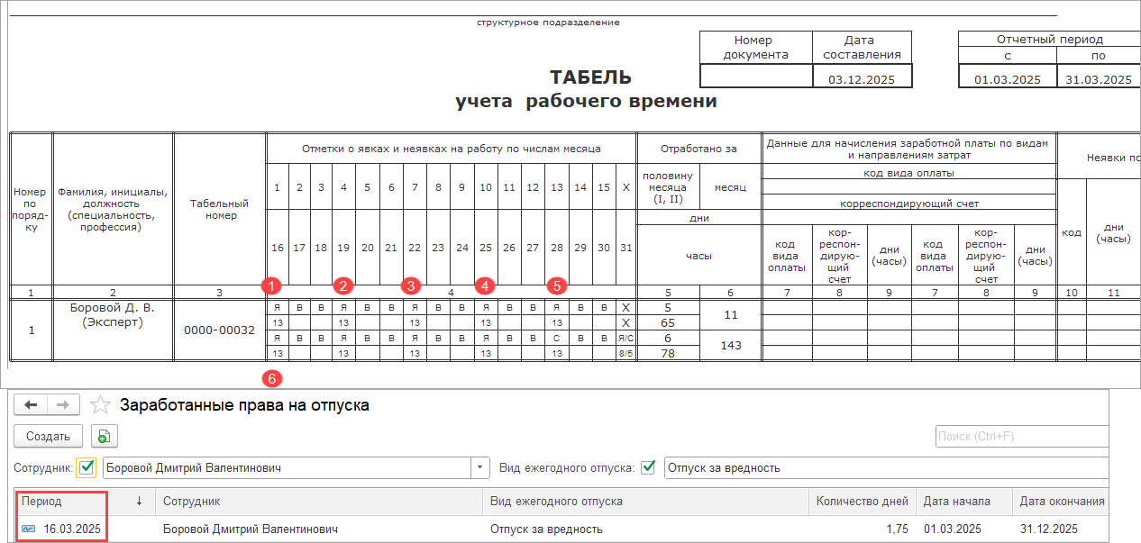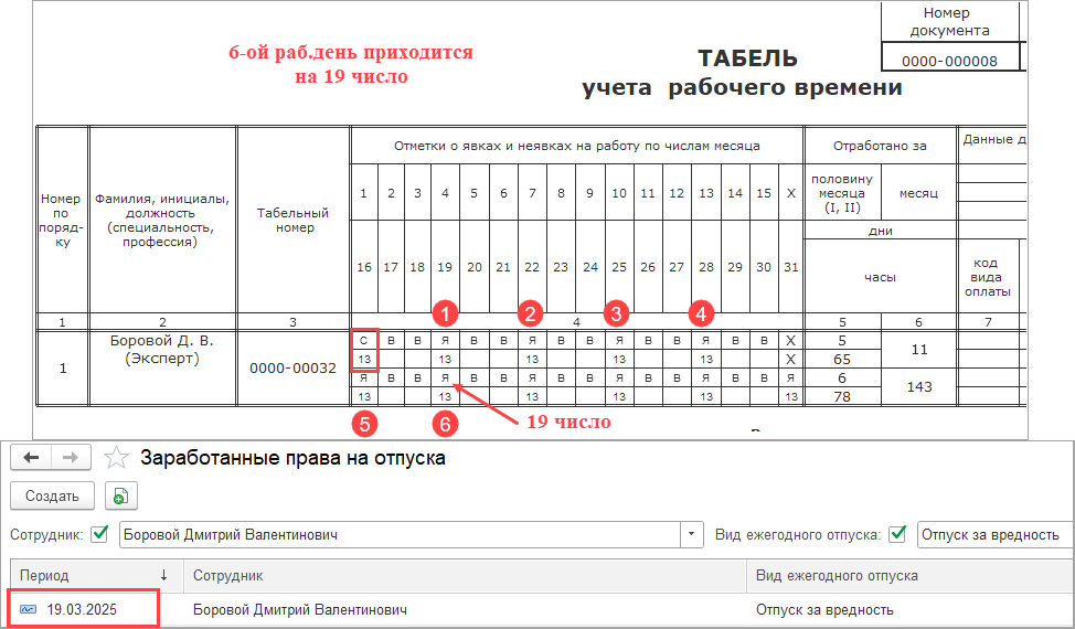 Соответственно первая дата, в которую накапливается отпуск 16 марта, если считаем по табелю 6 рабочих дней в первой половине месяца.