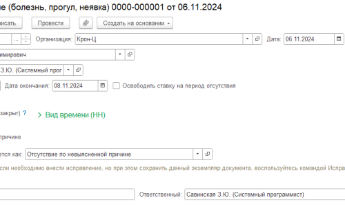 1) документ Отсутствие (болезнь, прогул,неявка) введен в ноябре с 6 по 8 ноября
