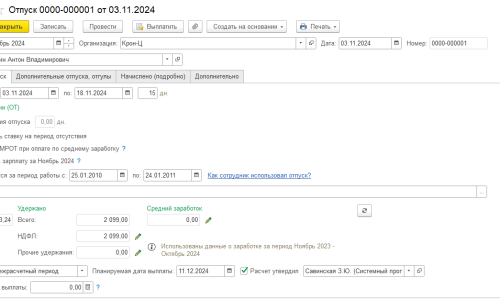 2) документ Отпуск введен в ноябре с 3 по 18 ноября