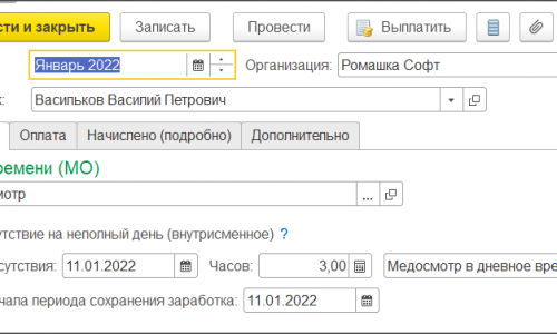 Здравствуйте, сотрудник проходит обязательный периодический медосмотр в течении 3-х часов рабочего дня, в программе провожу — отсутствие с сохранением среднего, ставлю — 3 часа. Возможно сделать так, чтобы оплата по окладу как то рассчитывалась с учетом часов, которые ужу оплачены по среднему?