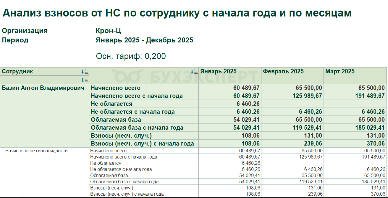 Можно воспользоваться донастроенным отчетом «Анализ взносов от НС по сотруднику с начала года и по месяцам».