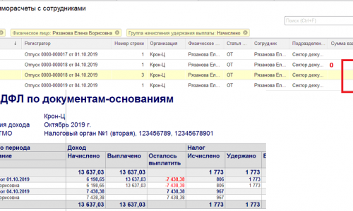 С выплатой всё верно, выплачивали мы по одному приказу. А дальше идёт корректировка, которая в результате дает 0 по сумме — это продление отпуска, продление дней.