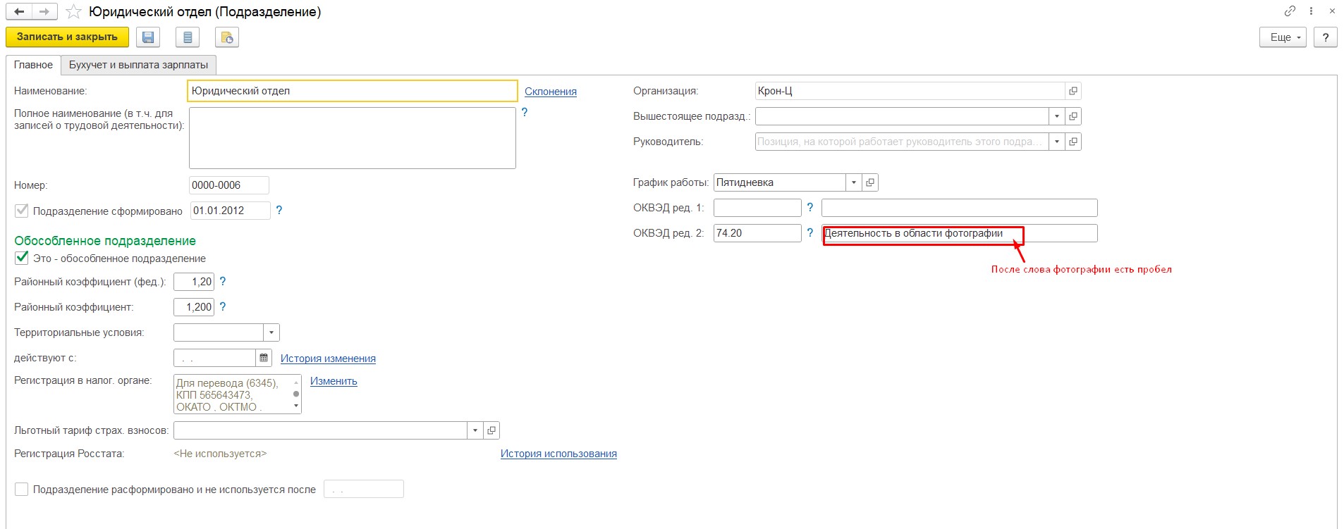 Давайте попробуем в подразделениях заново набрать код ОКВЭД и наименование и перезаполнить отчет.