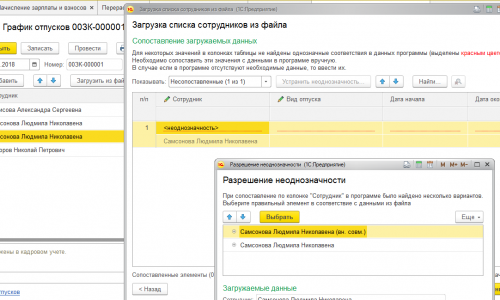 Да в этом случае программа напишет красным <неоднозначность> и попросит выбрать какой из двух сотрудников имеется ввиду. Необходимо выбрать нужного вручную (приложил скрин). Добавление в экселе к наименованию (вн. совм.) не помогает(((